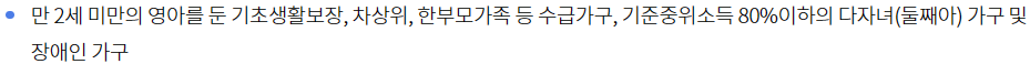O 지원 금액: 기저귀 구매비용: 월 9만원 (바우처) / 조제분유 및 이유식 구매비용: 월 11만원 (바우처)