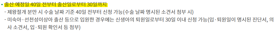-미숙아 출산 등으로 입원한 경우 신생아 퇴원일로부터 60일 이내 신청