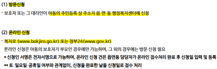 O 신청 방법: 대상 아동의 부모가 주소지 관할 동 주민센터 방문 신청