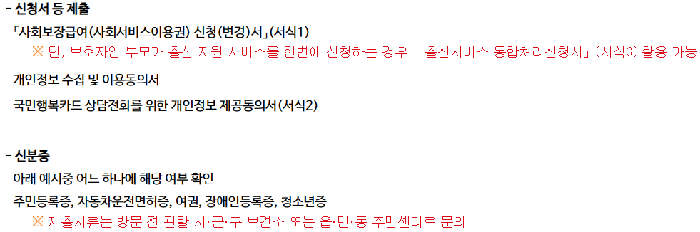 O 바우처 신청: 산모의 주민등록 주소지 관할 시군구 보건소 / 온라인 신청은 복지로(www.bokjiro.go.kr)