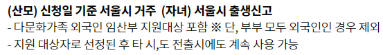 O 지원 기준: 신생아 출생일을 기준으로 6개월 전부터 신청일 현재까지 계속해서 구로구에 주민등록을 두고 실제 거주하고 있는 보호자(신생아는 보호자와 동일한 세대원이어야 함)