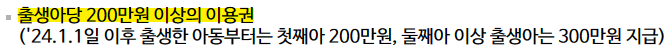 O 지원 금액: 기저귀 구매비용: 월 9만원 (바우처) / 조제분유 및 이유식 구매비용: 월 11만원 (바우처)